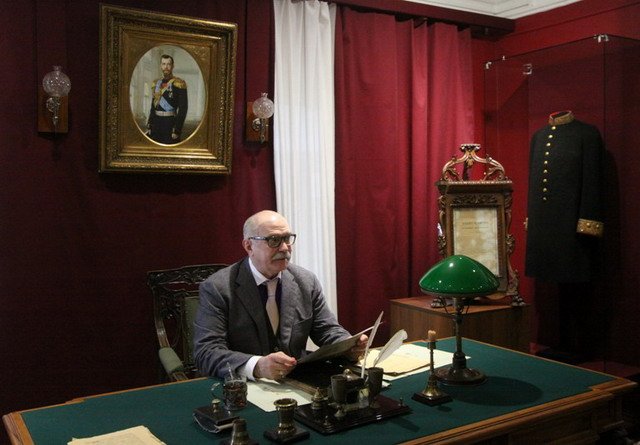 В экспозиции, где воссоздана обстановка кабинета П.А. Столыпина, Никита Михалков обращался к будущим зрителям, сидя за столом, за которым в свое время работал видный российский реформатор.