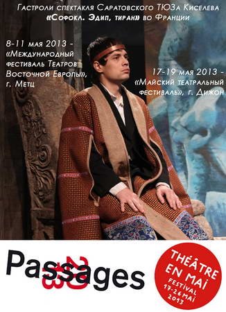 Эти гастроли — результат многолетнего сотрудничества театра и Французского института в России, они включены в официальную программу французско-русского театрального сезона, организованного Министерствами культуры Франции и России. Приглашение привезти спектакль "Софокл. Эдип, тиран" во Францию и принять участие в фестивале "Пассажи" театр получил ещё в ноябре 2011 года, когда в гостях у Саратовского ТЮЗа Киселёва находились крупнейший театральный деятель, продюсер, экс-директор Французского культурного центра Доминик Жамбон и выдающийся театральный критик и журналист Жан-Пьер Тибода, художественный селектор и арт-консультант фестиваля "Пассажи". Международный фестиваль Театров Восточной Европы "Пассажи" — важнейшее связующее звено между российской и европейской театральной традицией, представляющей последние достижения театрального искусства нашей страны не только французскому зрителю, но и всей Европе. Свою историю фестиваль "Пассажи" ведёт с 1996 года, и с тех пор успел сменить несколько небольших французских городов в качестве своего дома. С 2011 года фестиваль приютил у себя город Метц.