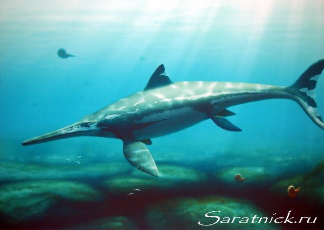 Платиптеригиусы (Platypterygius) были последним из известных сейчас родов ихтиозавров и существовали на планете с начала до середины мелового периода. Они обитали в морях почти по всему миру, в том числе и на территории нынешней Саратовской области. Их останки находили в России, Европе, Америке, Австралии. Это были крупные ящеры, достигавшие в длину 9 метров. Видимо, они могли быстро перемещаться в воде и были хищниками. Охотились на некрупную добычу – рыб и головоногих моллюсков. Их узкие челюсти имели большое количество коротких, но массивных зубов конической формы.