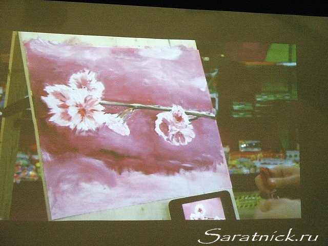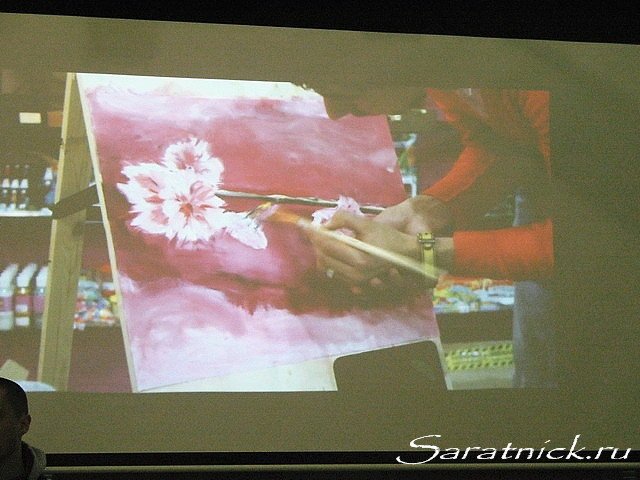 Вот и на открытии выставки «Полный цвет» посетителям был предложен мастер-класс от Сергея Коптева, или, если хотите, интерактивный урок живописи, который демонстрировался на большом экране.