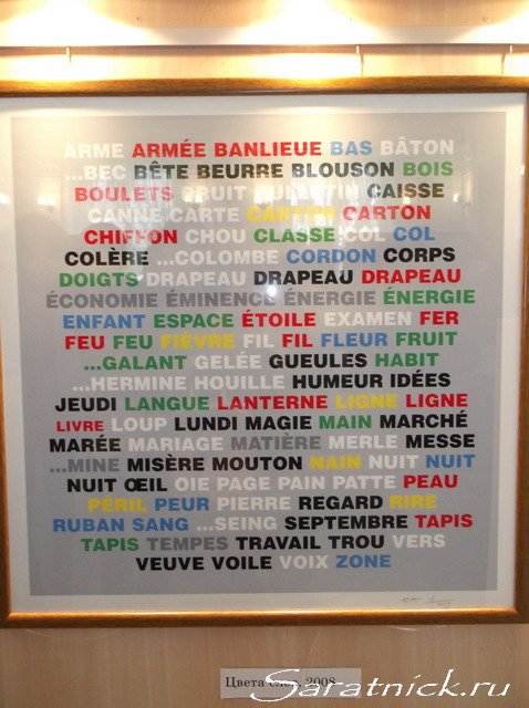 Здесь, как сказал Клод Фор, важно не только читать слово, но и произносить цвет, которым оно написано. В итоге слова обретают дополнительные значения и наполняются тем смыслом, который в них вложил художник, но тут уже без знания языка, как вы понимаете, не обойтись. Ну, например, слово «armée», написанное красным цветом (rouge), становится Armée rouge или Красной армией.