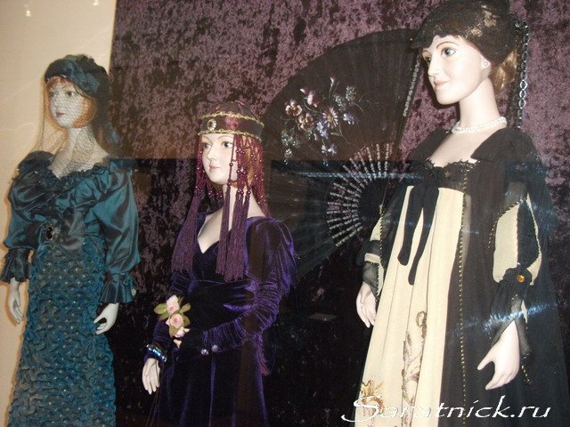 Что касается самой экспозиции, то первое на что обращаешь внимание, попадая на выставку, это ростовые куклы: А.С. Пушкин и две дамы, олицетворяющие Юность и Зрелость.