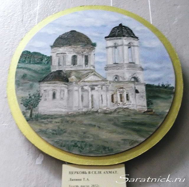 Ещё одной интересной частью экспозиции являются пейзажи Тамары Алексеевны: «Новая набережная», «Берег Волги», «Ахмат». Здесь хотелось бы отметить одну любопытную деталь. Дело в том, что и у Тамары Алексеевны Лапиной и у её дочери Екатерины есть картины с одинаковым сюжетом и названием – «Церковь в селе Ахмат». Не знаю, было ли так задумано при оформлении выставки, но эти работы висят рядом и наглядно иллюстрируют насколько по-разному видят художники одну и ту же ситуацию, насколько различаются их художественные стили и трактовка сюжета.