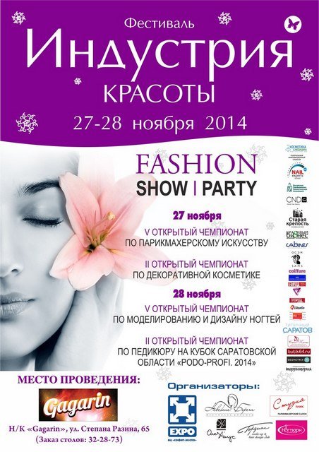 28 ноября пройдет V открытый чемпионат по моделированию и дизайну ногтей, участникам предложены номинации: «Моделирование» (акриловая и гелевая технологии, салонное моделирование) и «Дизайн ногтей» («Современный маникюр в салоне красоты» и «Работа с гель-лаками»), также в рамках чемпионата пройдет фотоконкурс. В этот же день пройдет II открытый чемпионат по педикюру на кубок Саратовской области «PODO – PROFI. 2014».