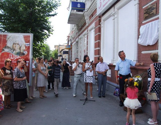 Е.В. Кузнецова с мужем и маленькой дочкой приехали в Саратов, чтобы привезти изготовленную из карельского гранита мемориальную доску и присутствовать на церемонии ее открытия. Елена Владимировна поблагодарила всех саратовских краеведов, помогавших ей восстановить историю семьи, и преподнесла в дар музею краеведения рекламный листок с адресами врачей и лечебных учреждений Саратова, изданный в 1912 г. аптекой Н.И. Шмидта. Этот раритет ей удалось приобрести у коллекционеров через Интернет накануне приезда в Саратов.
