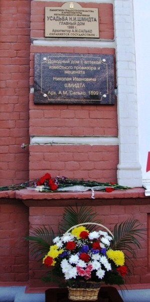 По инициативе Саратовского областного музея краеведения 27 июня в нашем городе была открыта мемориальная доска в память о Николае Ивановиче Шмидте – потомственном саратовском провизоре, известном своей благотворительностью. Она установлена на доме № 53 по Московской улице (угол Соборной), где на первом этаже в XIX – начале XX века располагалась знаменитая «Старая аптека на Московской».